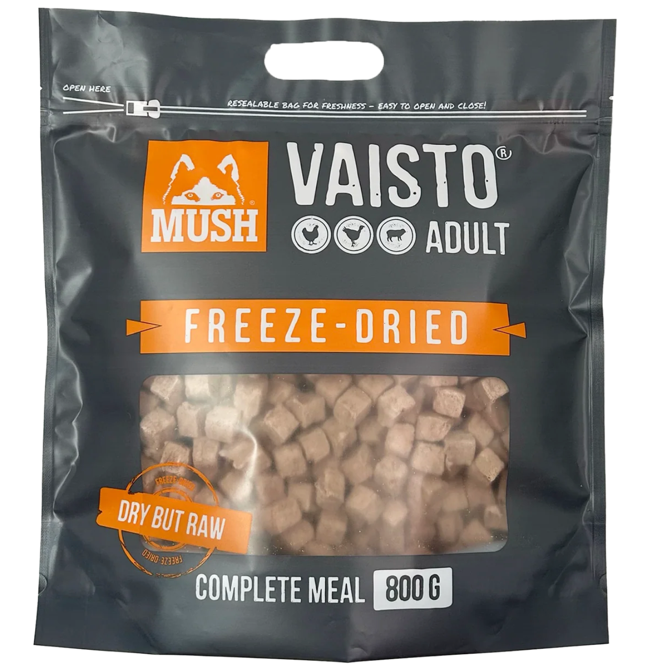 MUSH Vaisto GRÅ (KYLLING, KALKUN og LAM) er et frysetørret fuldfoder til hunde, som er supernemt at have med dig når det er lidt besværligt med råt - fx ud og rejse, på udstilling eller lignende.